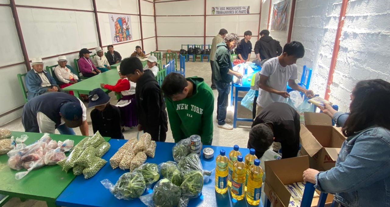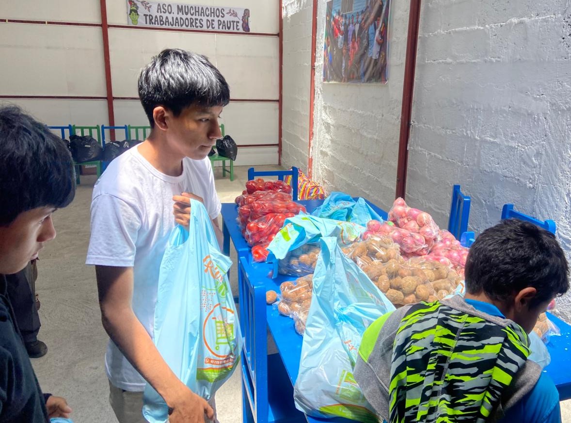 The number of members in the association of the Muchachos Trabajadores of Paute has varied with the years, but about 40 to 50 regularly attend the weekly meetings. They are boys and girls between the ages of 6 and 17, and 620 children have participated during the association’s lifetime. They have their own governance committee and the support of Father Hernan Rodas and Ms. María Barrera from the Paute community. Every week, the children meet for a common meal and to prepare a food bag with basic products— vegetables, meat, fruits— that they later distribute to the needy elders in the community. For that, they also collaborate with the local market run by the Paute’s women’s association.